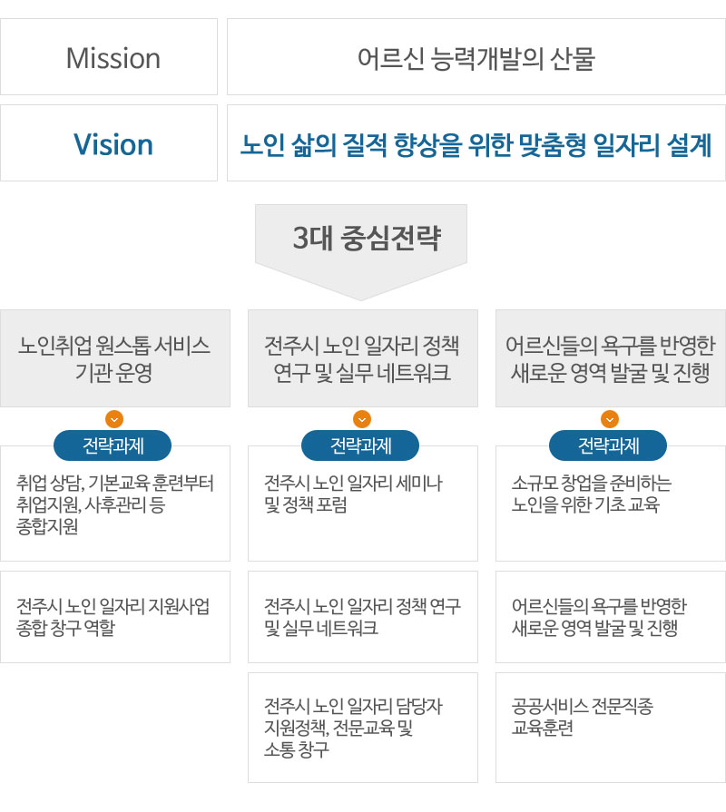 전주시노인취업지원센터에서는 지속적으로 구인 업체를 발굴하여 취업을 희망하는 노인들에게 맞춤형 상담을 통하여 좋은 일자리를 추천해 드리고, 구인기업에 우수한 인재를 소개하여 성공적인 비즈니스를 도와 드리고 있습니다.| 설립년도 | 2009년 4월 |